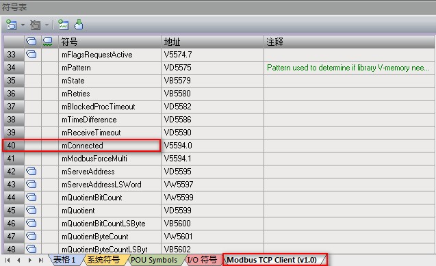 S7-200 SMART CPU作为Modbus TCP客户端时:通过Modbus TCP Client指令 MBUS_CLIENT 的符号表中的 mConnected 参数来判断,如图1.所示