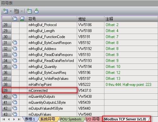 S7-200 SMART CPU作为Modbus TCP服务器时:通过Modbus TCP Server指令 MBUS_SERVER 的符号表中的 mConnected 参数来判断,如图2.所示