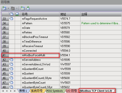 功能,则 MBUS_CLIENT 指令将返回错误代码 1。Modbus 客户端协议允许强制 MBUS_CLIENT 指令使用多个位/字 Modbus 功能,而非使用单个位/字 Modbus 功能。可通过在 Modbus 客户端符号表中查找符号 mModbusForceMulti,并在程序执行 MBUS_CLIENT 之前
